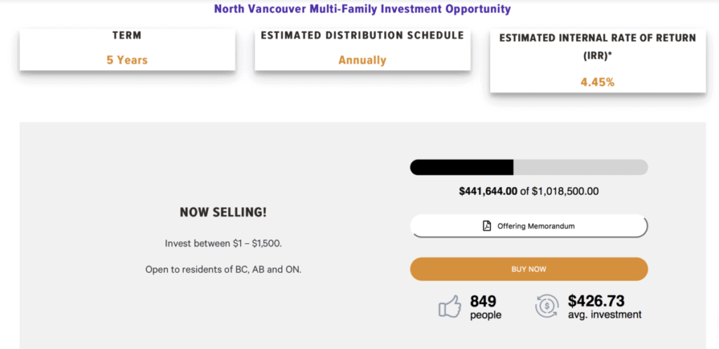 These fees will vary depending on the property and are broken down within the Offering Memorandum that addy provides. The offering memorandum (OM) is the document that addy has pulled together that summarizes the details of this investment opportunity. Each property has a different estimated term, estimated return and estimated distribution schedule