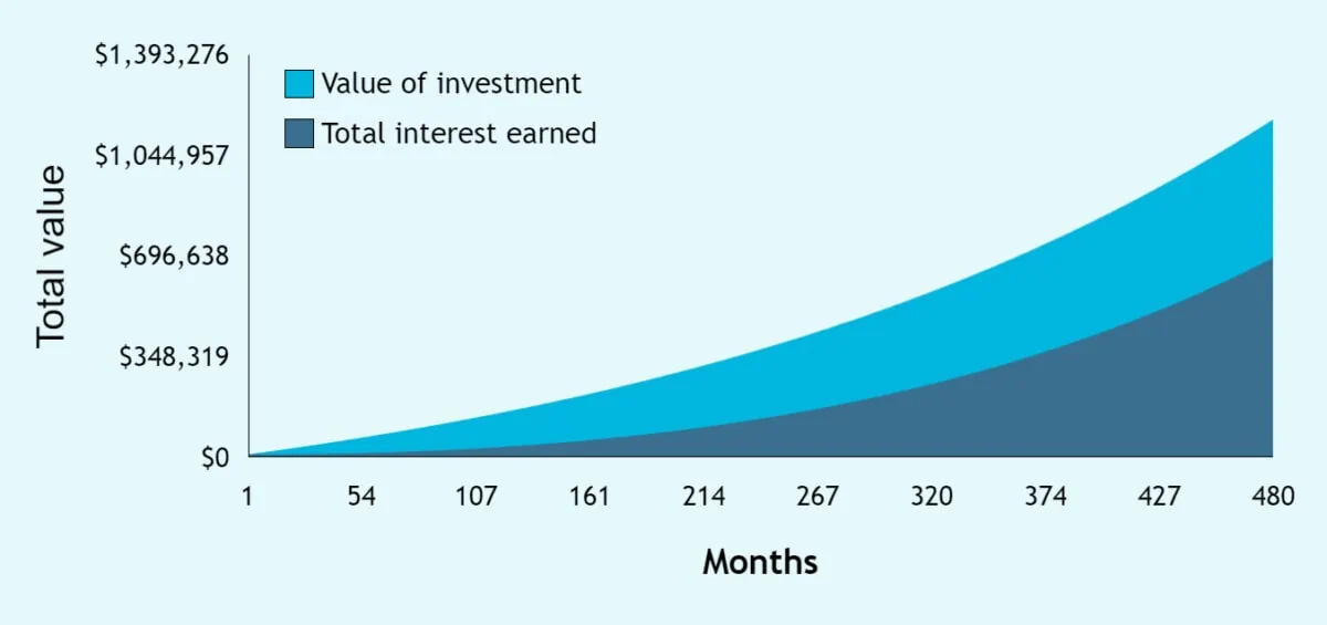 In the diagram above, if you had a monthly investment of $100.00 at an annualized interest rate of 4% will be worth $116K after 40 years when compounded yearly.