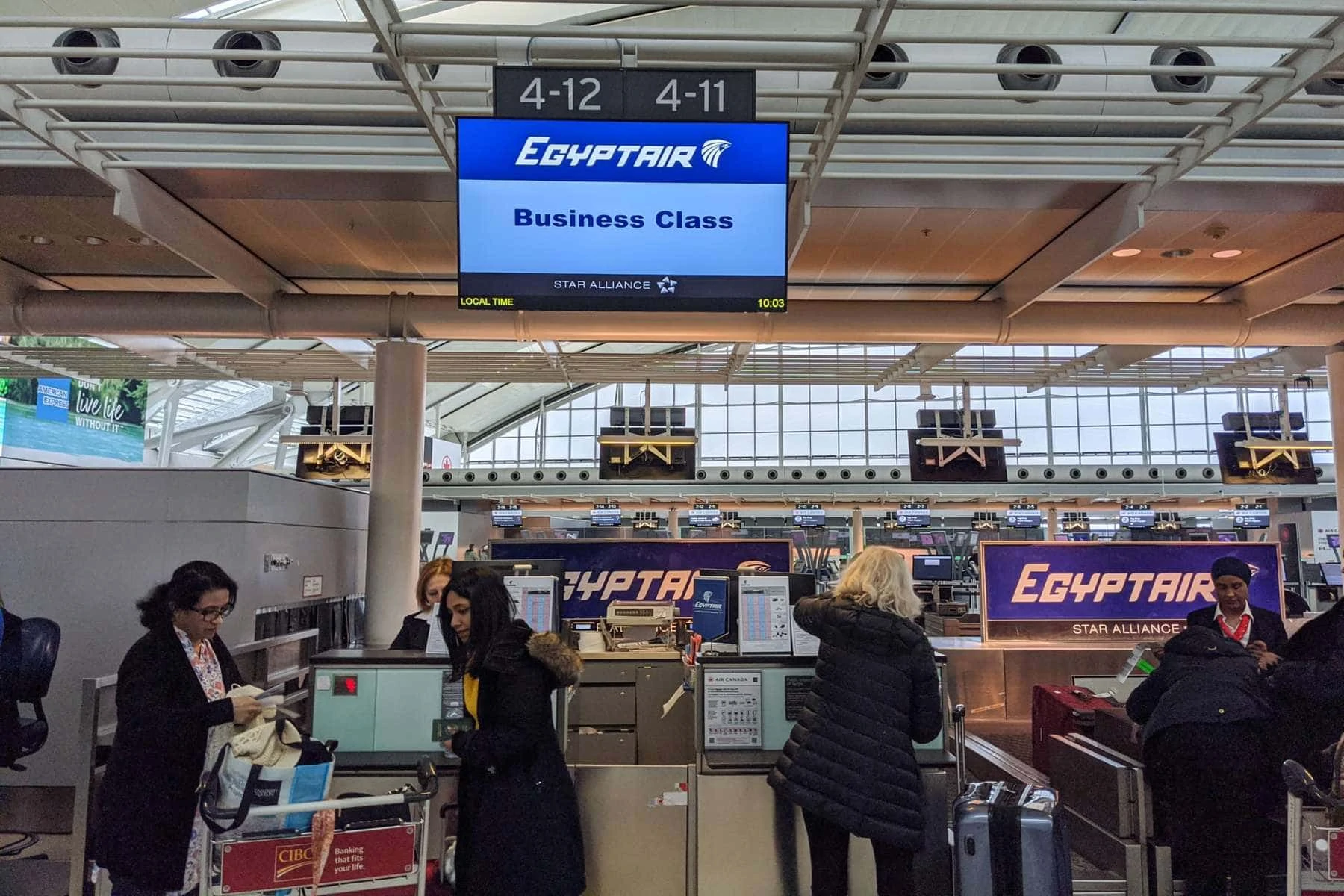 EgyptAir operates out of Terminal 1 at Toronto’s Pearson International Airport. Pearson has automated check-ins where you can print your own luggage tags, but you still need to go to the desk to drop off your bags. Fortunately, business class passengers have a separate desk. Pro tip, if you print your own luggage tags, don’t put them on right away as customer service needs to add priority labels to your bags.