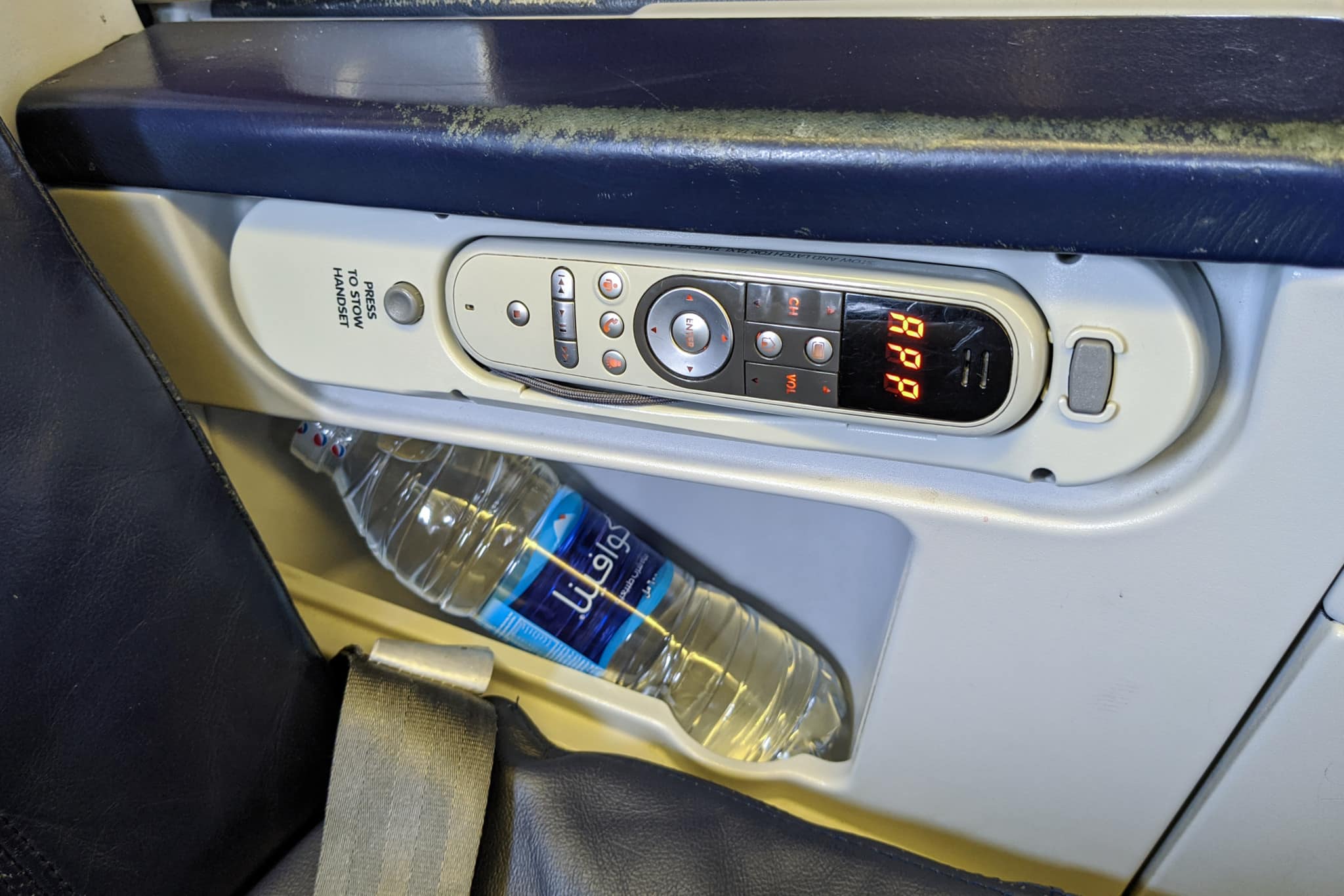 Even though you have a touch screen, you need to use a remote for the entertainment system unless you enjoy leaning forward quite a bit. Every seat came with a water bottle which was about 500ml. It’s nice to have water, but that little area where the bottle is was the only storage space that you had direct access to. I could only put a few small things in there.