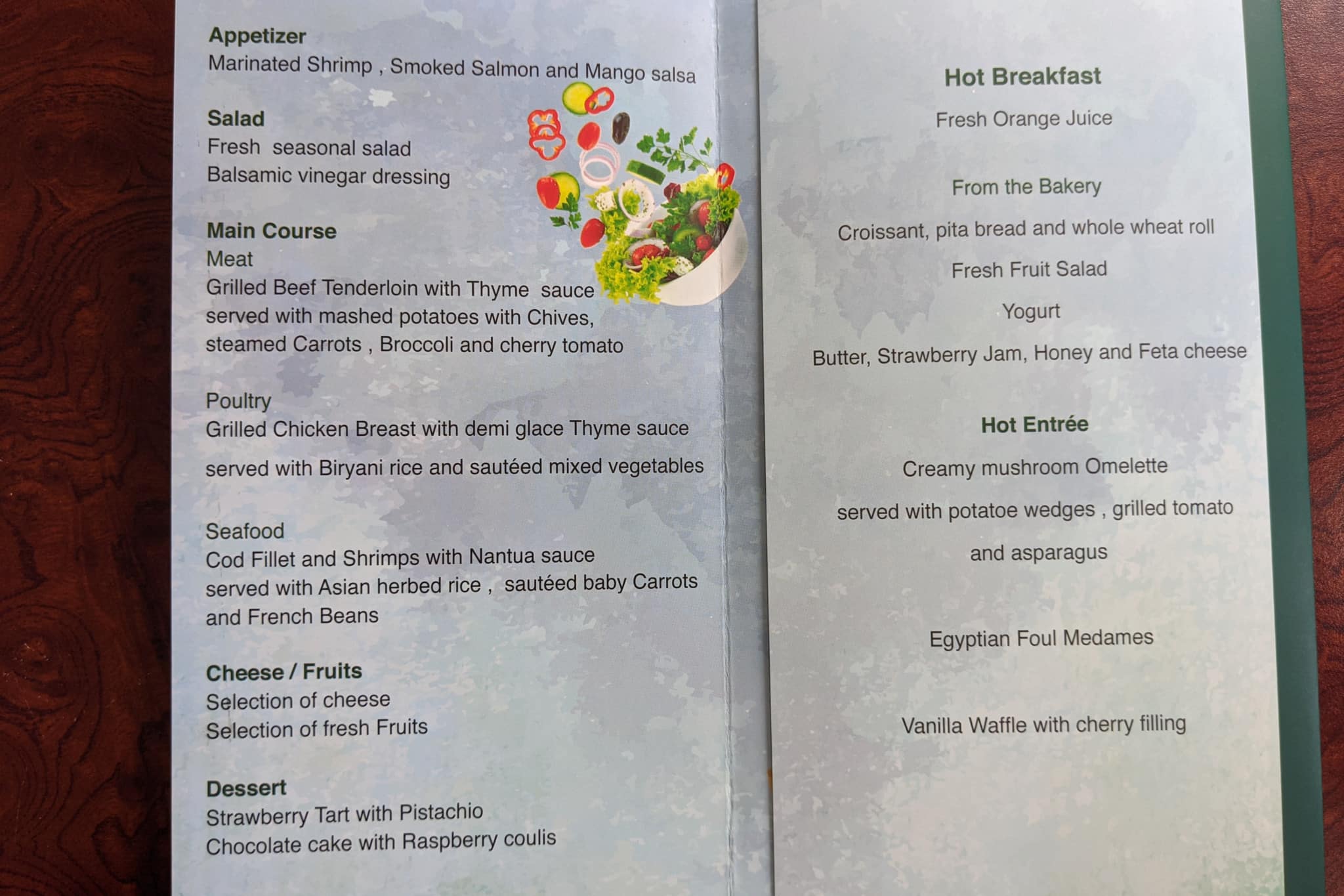 Lunch or was it dinner was served about an hour after takeoff. What’s up with the one random image of a salad? You really only get to choose your main and dessert.