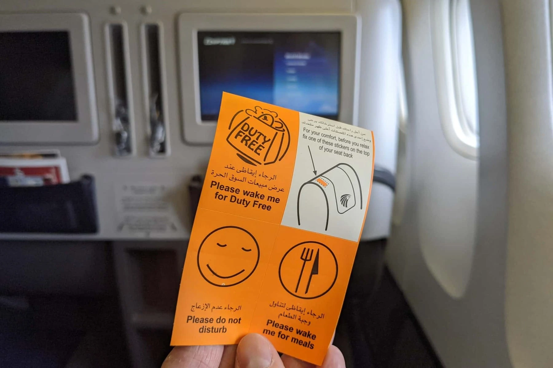EgyptAir gives you these stickers so you can tell the staff what you prefer. Just stick it on the headrest and they’ll act accordingly.