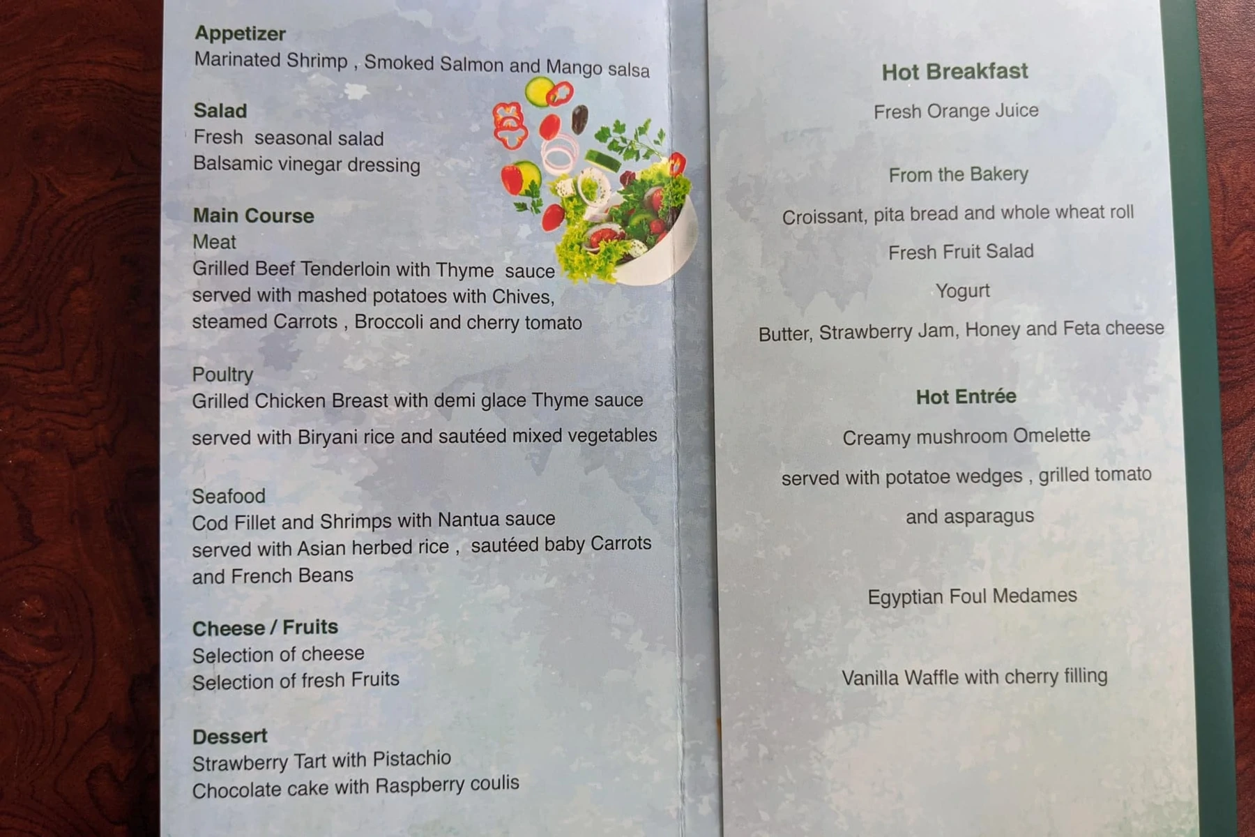 An hour and a half before landing, they started to serve breakfast. The choices were a mushroom omelette or foul medamas which is an Egyptian dish consisting mainly of fava beans. The food here was okay, but it wasn’t anything special.