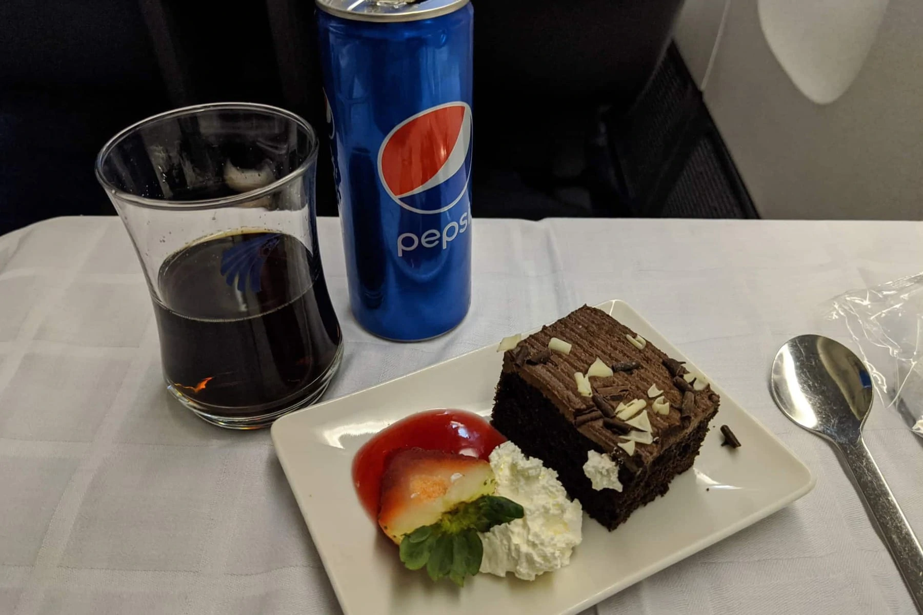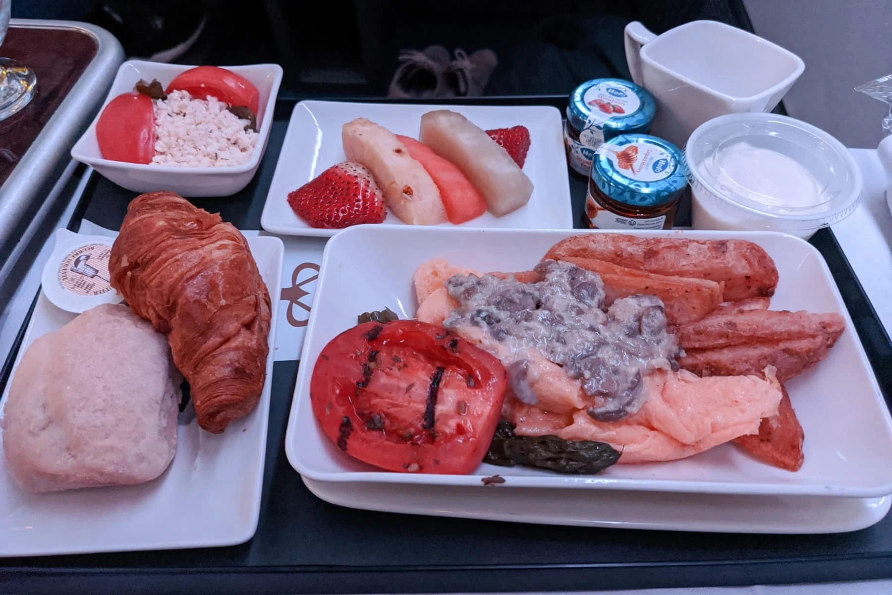When it’s time for the main course, they simply replace your appetizer plate. Although this is efficient, it didn’t make me feel special. What really annoyed me is that they ran out of beef for the mains. When I’m in economy, I don’t care, but running out of specific dishes for your business class passengers is a bit ridiculous. I ended up choosing shrimp and cod. The food itself tasted decent, but after having shrimp and salmon for my appetizer, I wasn’t too excited about having something similar for my main.