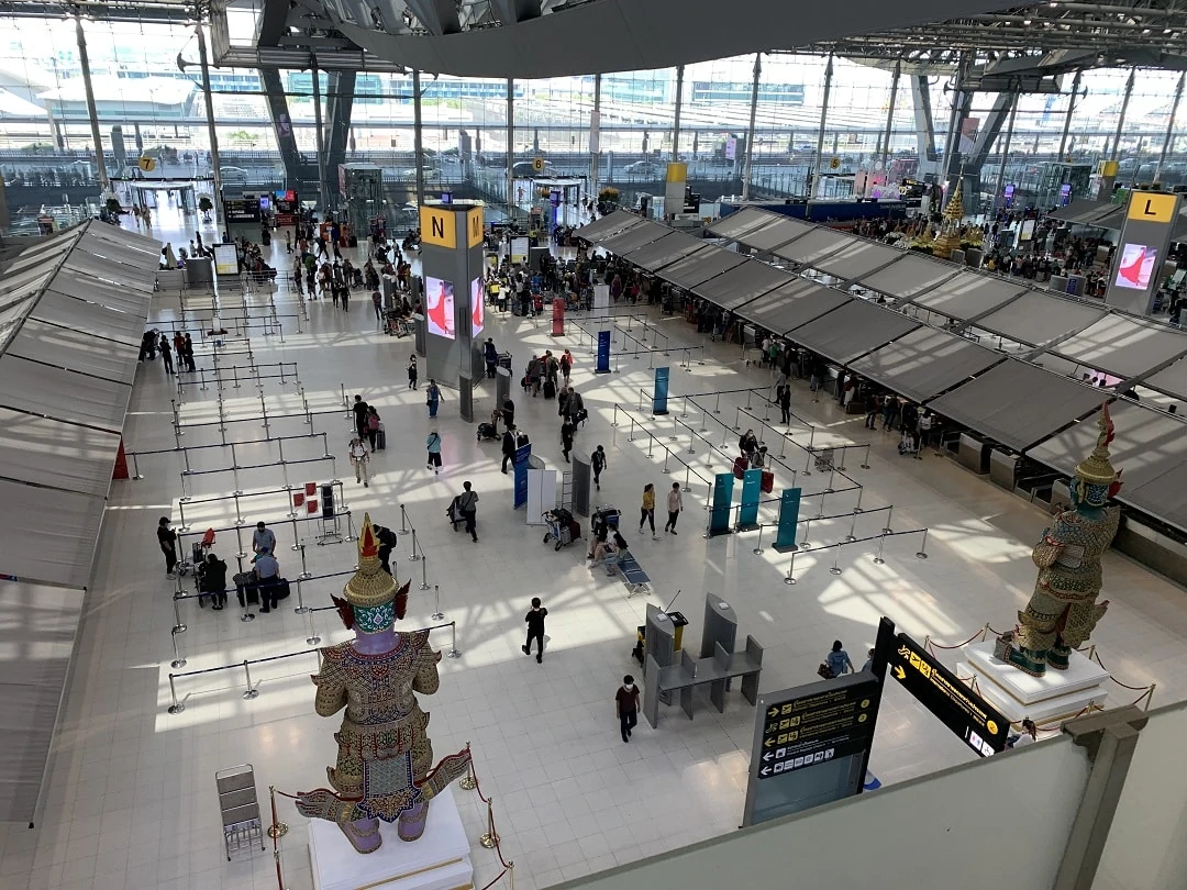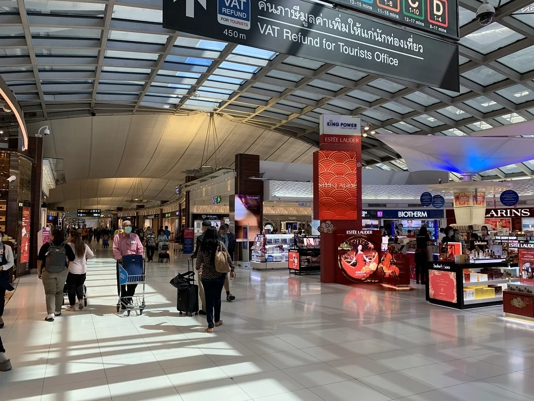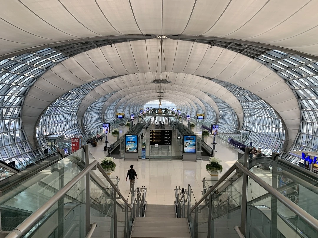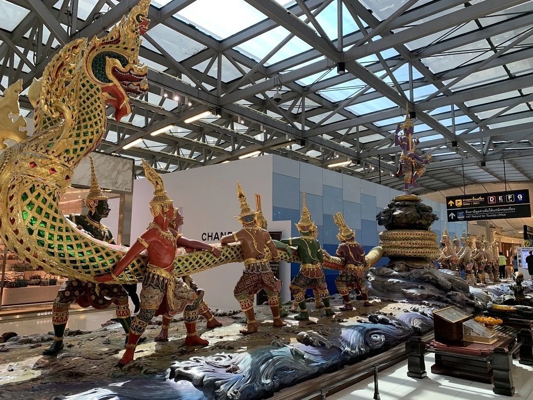 Bangkok Suvarnabhumi Airport is in the shape of a horizontally wide stretched H shape. From the art sculpture which is located right in the middle, going either left or right down the hallways brings you to many of the same shops and restaurants. Don’t feel that you may be missing out on anything if you choose to go one direction. If you head in the direction of your gate, you’ll likely come across the same stores as going the opposite way.
