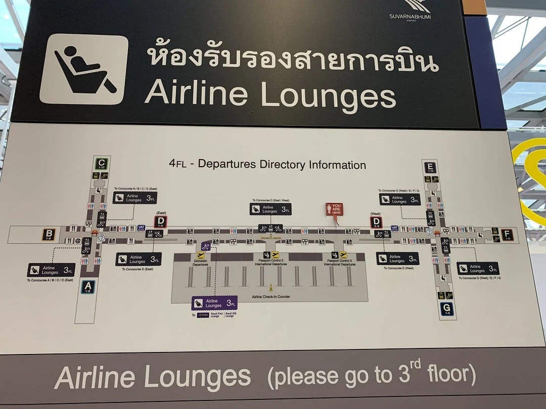 Airline lounges at Bangkok airport are on the 3rd floor which is one floor down from departures on the 4th floor. Bangkok Suvarnabhumi has a lot of lounges. I counted 22 on the map though it could be less assuming some airlines were sharing lounges. My gate was in Concourse G so I headed towards that direction to the Oman Air Lounge which is in the nearby Concourse E.