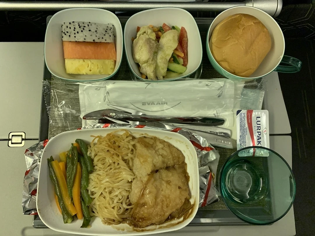 The fish and noodles were quite good. The fish was battered through soggy from the sauce and being reheated. The noodles were springy and worked well with the sweet sauce. Also notice that EVA Air continues to provide steel utensils instead of plastic. A trick to defrost the butter is to let it sit on top of the main entrée’s foil cover for a bit before you unwrap the plate and eat.