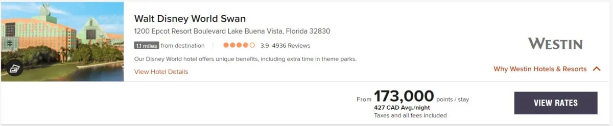 In addition, Disney World often has sales that target Canadians. The offers vary, but one recent promotion allowed you to save up to US$400 on park tickets and hotel packages. This isn’t points related, but it’s worth pointing out if you want to save. For reference, Disney World has four theme parks, so spending multiple days there is not uncommon.