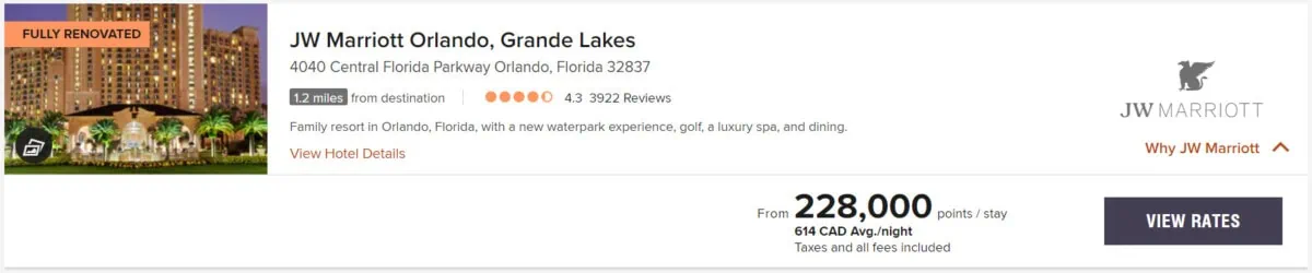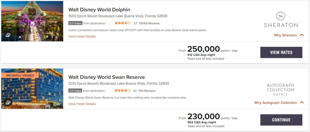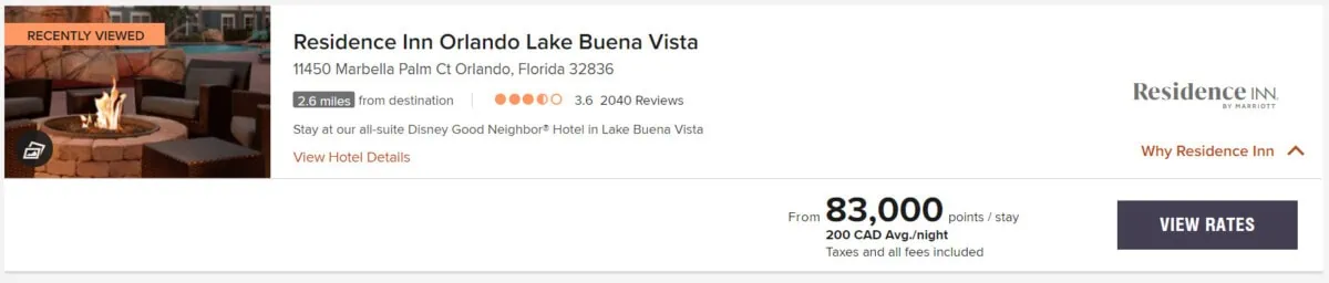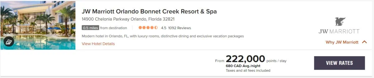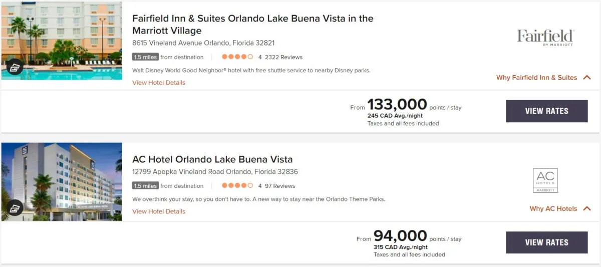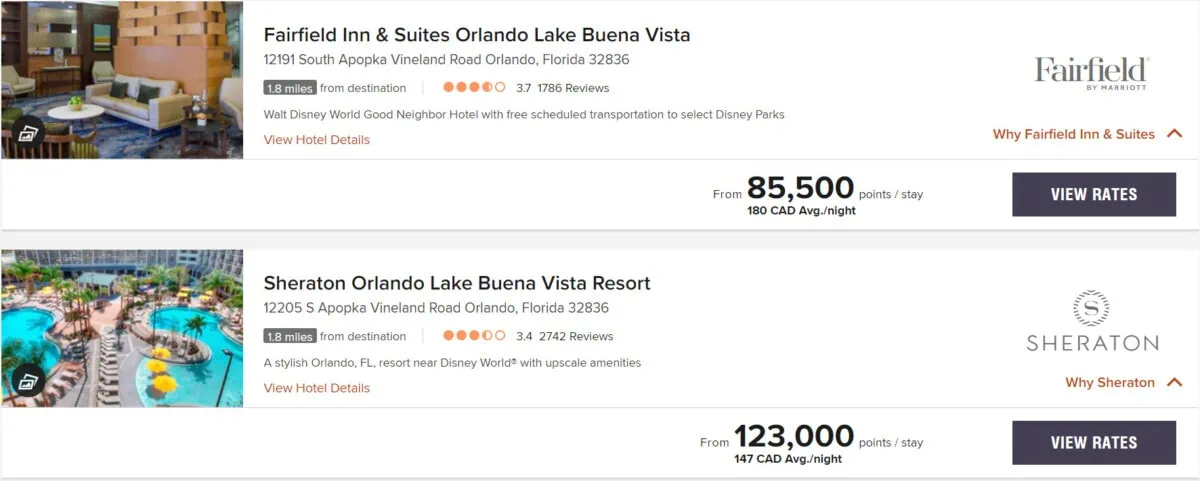 What’s great about Orlando is that there are many properties you can book on points. Generally, Canadians will want to focus on Marriott Bonvoy properties since those are the easiest points to earn. You’ll also want to think about what type of stay you want. For example, do you want luxury, family-friendly, or the lowest cost?