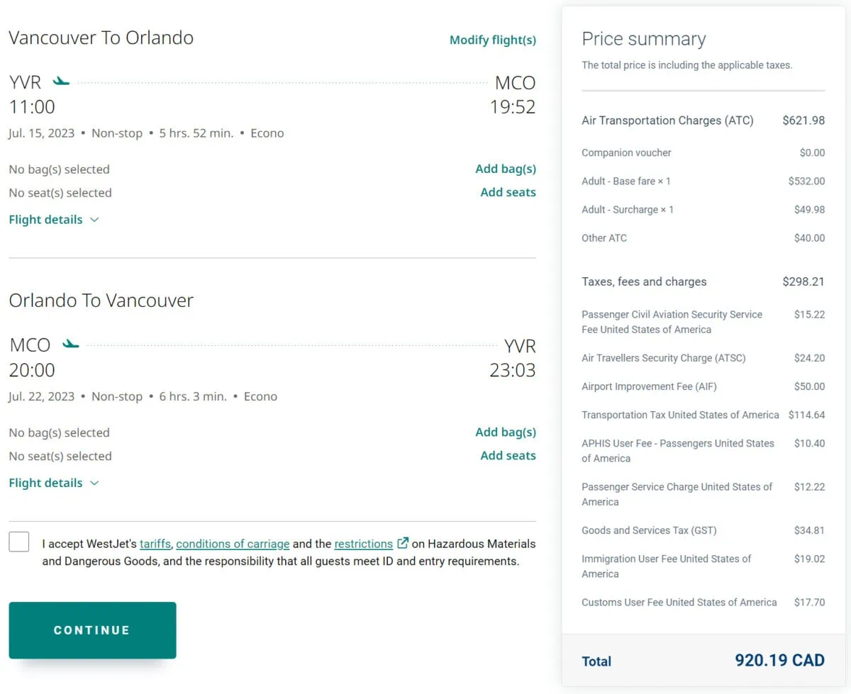 Here’s how the savings would work if you have a WestJet companion voucher and you’re flying from Orlando.