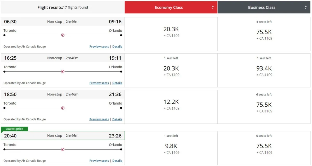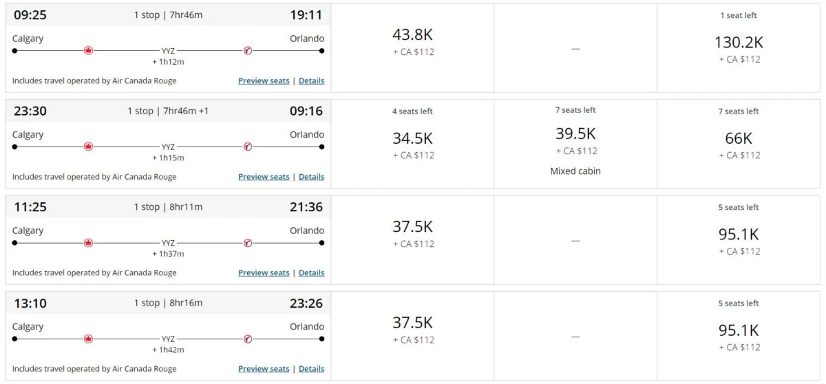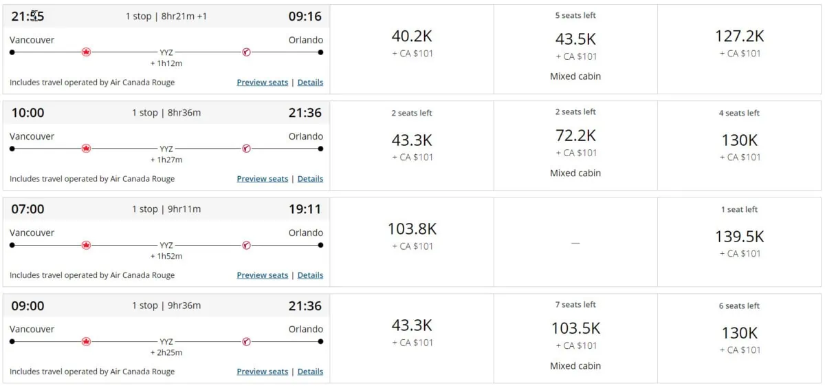 Air Canada’s loyalty program is called Aeroplan. Generally speaking, it’ll cost you roughly 30,000 – 50,000 Aeroplan points for a return flight to Orlando during the summer if you’re flying from eastern Canada. If you’re flying to Western Canada, it could easily cost double that. That said, I’ve flown for as little as 20,000 points during slower seasons.
